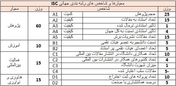 در جدول زیر شاخصهای مورد استفاده در رتبهبندی جهانی ISC نشان داده شده است.